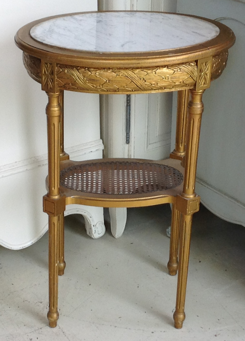 white marble top and cane base. It stands on four fluted and tapered sturdy