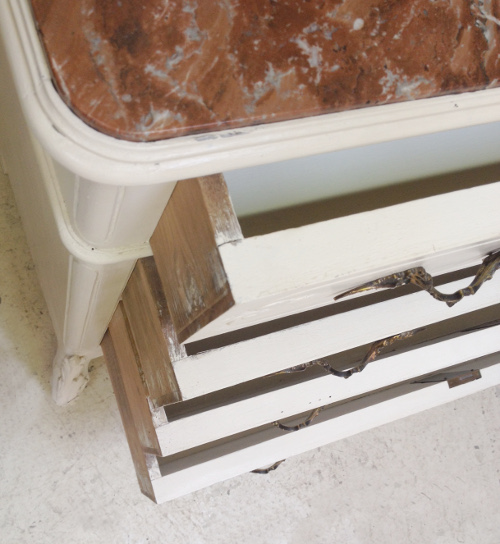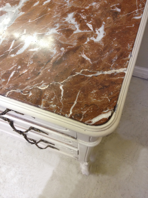the bevelled mirror in excellent condition for its age. It has a red, brown, grey and white marble top