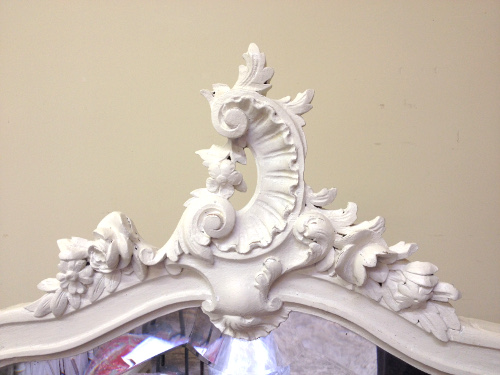 It comprises a wonderfully decorative mirrored with a crest to the top featuring shells, flowers, and leaves,