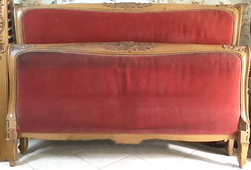 This original old French capitone custom kingsize scroll end bed is in its 'as found' condition with
