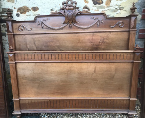 A superb quality Louis XVI style solid walnut double bed features a wonderful crest to the head