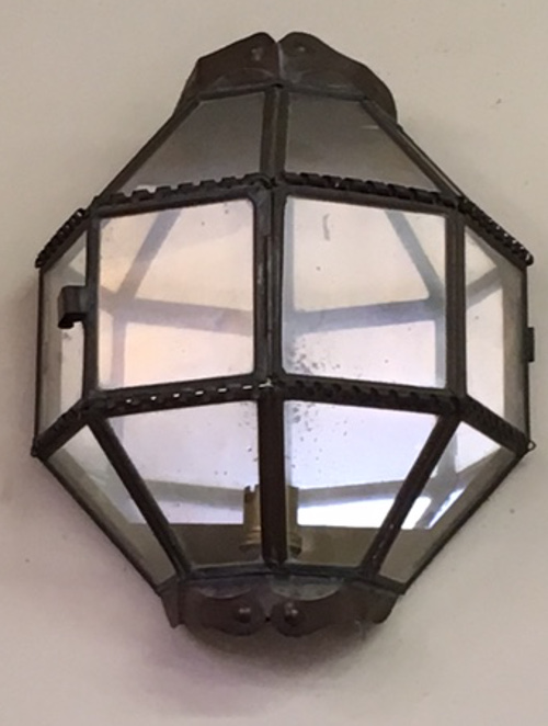 Old Wrought Iron Mirrored Back Hall Light with shaped banels of glass and an old mirror at the back.